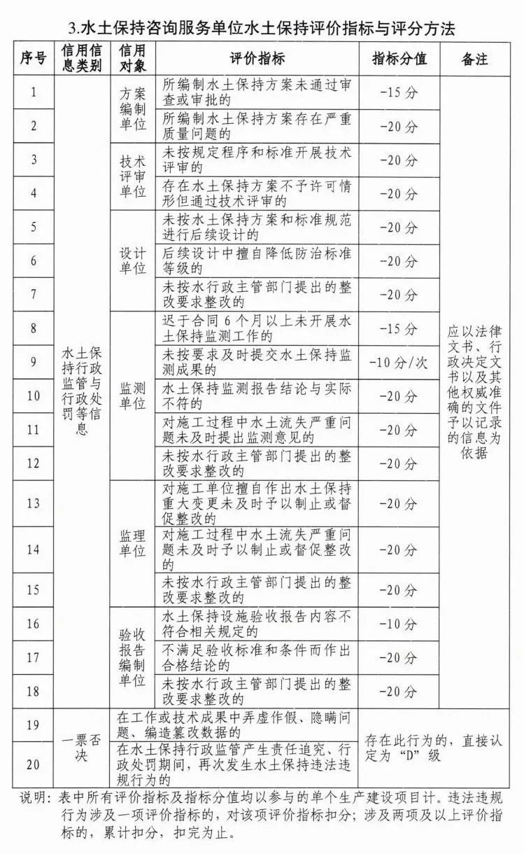 (四)信用评价标准。水利部制定全国水土保持信用评价标准,针对生产建设单位、水土保持施工单位、水土保持咨询服务单位管理要求和水土保持信用信息类别,分别明确具体评价指标和评分方法(详见附件),并根据实施情况建立动态调整机制。