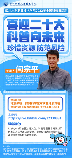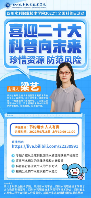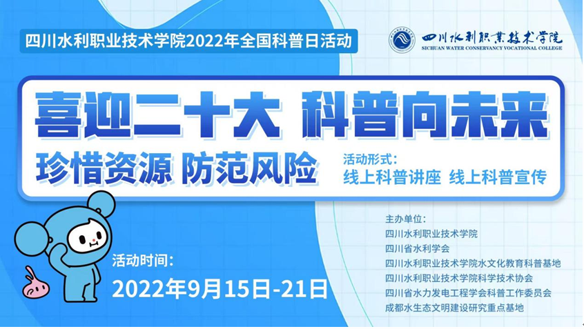 喜迎二十大,科普向未来!四川水利职业技术学院将于9月15日至21日开展主题为“珍惜资源 防范风险”的2022年全国科普日活动。
