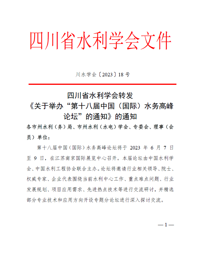 四川省水利学会转发《关于举办“第十八届中国(国际)水务高峰论坛”的通知》的通知