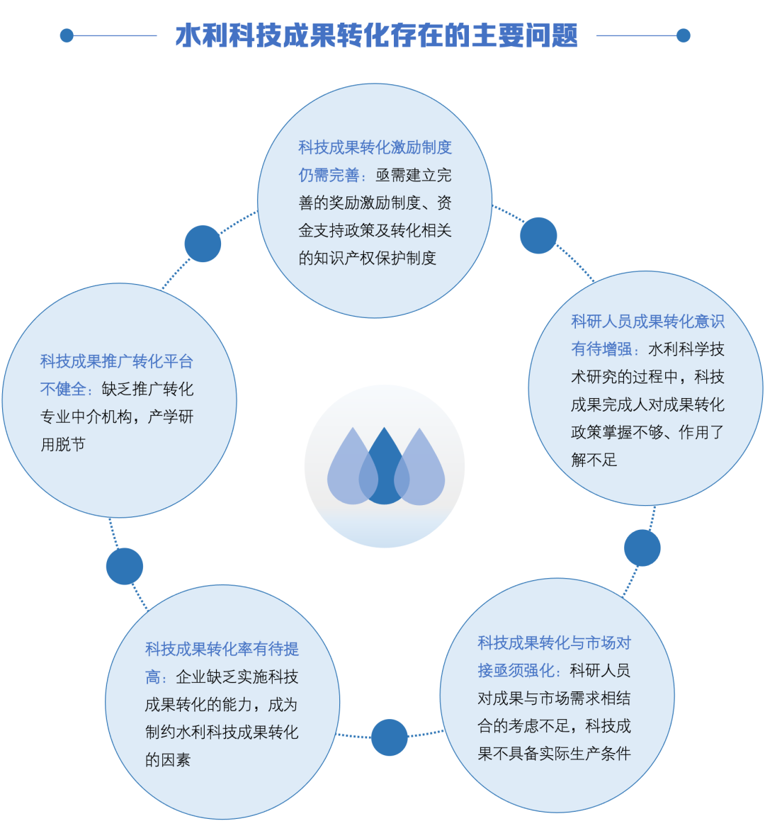 当前,虽然水利科研单位已认识到科技成果推广转化的重要性,但仍存在科技成果转化激励制度仍需完善、科研人员成果转化意识有待增强、科技成果转化与市场对接亟须强化、科技成果转化率有待提高、科技成果推广转化平台不健全等问题。