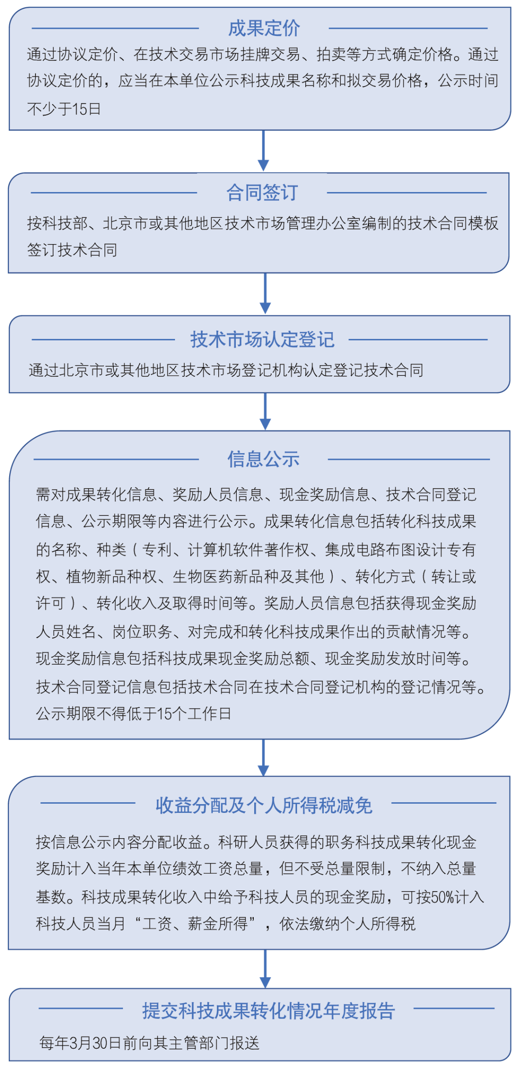 科技成果转化前应先通过协议定价、技术市场挂牌交易、拍卖等形式对成果定价,其中协议定价的需公示;定价后签订技术合同,并提交技术市场登记机构认定登记;认定为技术合同的可分配转化收益,分配前方案需公示;成果转化收益可按50%缴纳个人所得税;成果转化情况需向主管部门提交年度报告。